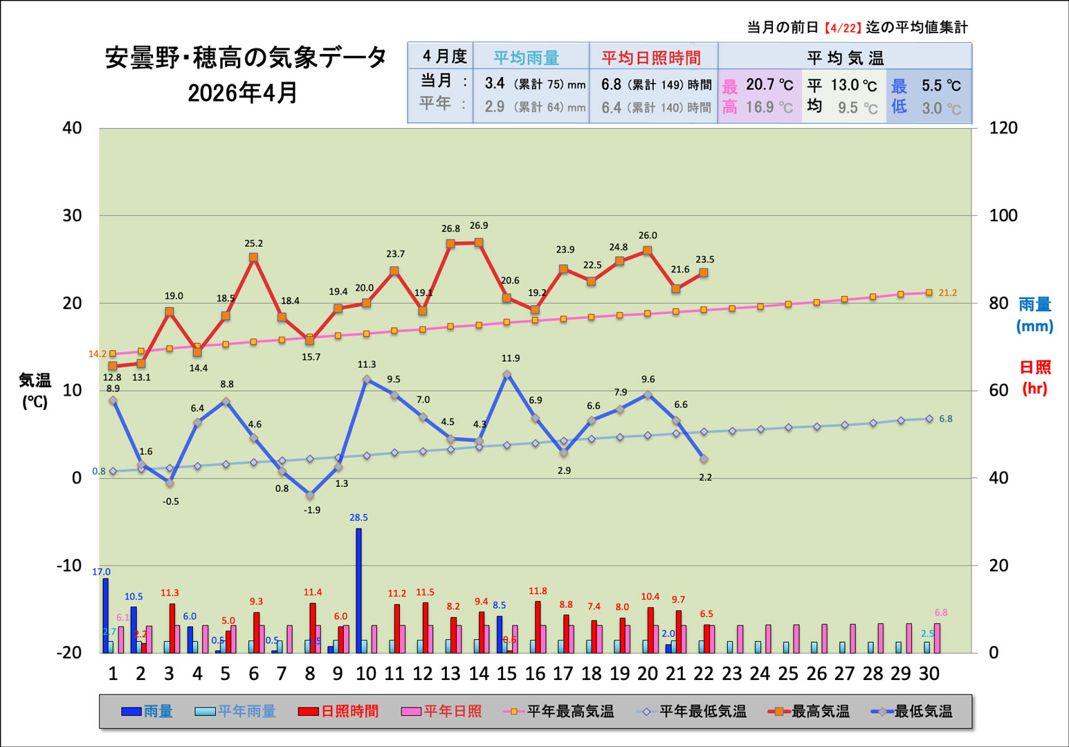 すっかり綺麗になって初焚きは来シーズンにした矢先、本日は終日雨で冷え込んだ。安曇野・穂高の最低気温は7.2℃、最高は14.4℃と冬に逆戻りしたかのようで、今日はエアコンで凌いだ。昨日までの気象状況は、
