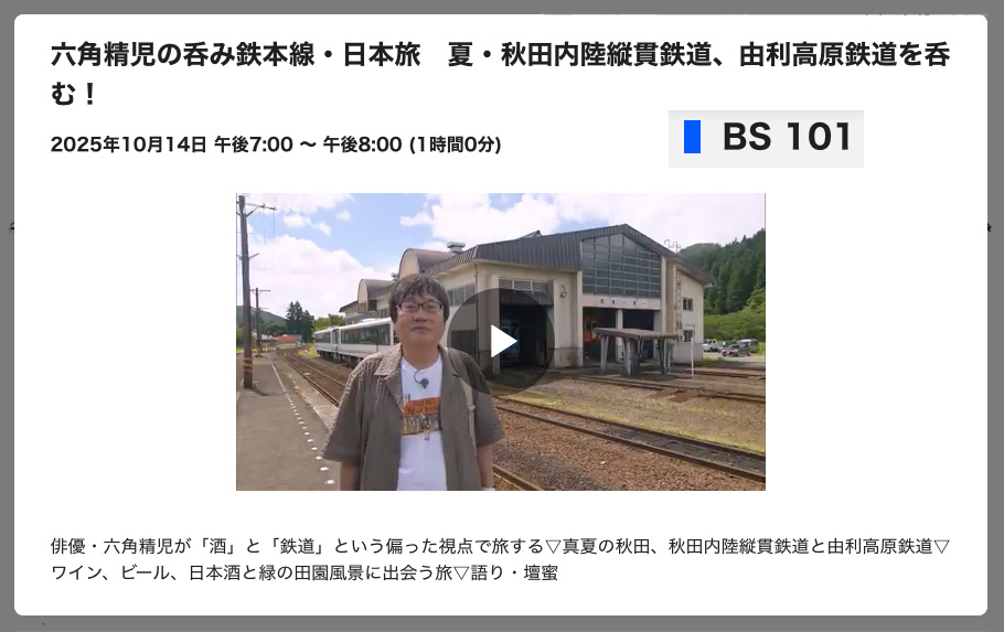 六角精児の飲み鉄本線が報じられる。今現在は夕刻。録画予約していて、後で見るのが楽しみだ。不定期の番組だけど、情報を集めていて年数回の放映を見逃さないようにしている。今日はどんな旅になるのだろう。