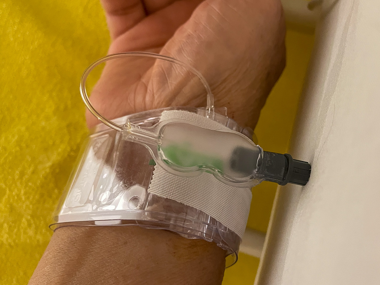右手首に局部麻酔をしてこのループ状の細い管の中にカテーテルを差し込む。痛みは最初にシースと言う太いものを血管に入れる時に、医師がかなりの力を込めて挿入するので痛みが走った。心臓に至る血管壁には神経がないので痛みは感じないが、カテーテルの先端が上腕を通過する時は移動していくのを感じた。オペでは右側の手首からカテーテル、左手からは点滴と造影剤が注入された。右手からのカテーテルは動脈血管に注入され、その他に首筋からは静脈の血管にこれ又カテーテルが挿入されて、心臓の筋肉の組織検査のためのサンプリングが行われた。内科医2名と放射線科医1名、それと医療スタッフ3名の体制で1時間半ほどのオペだった。局部麻酔だったので、オペ中は会話はしっかり聞こえて専門用語が飛び交い、また内科医同士の会話で時として意見相違していたのが印象に残った。