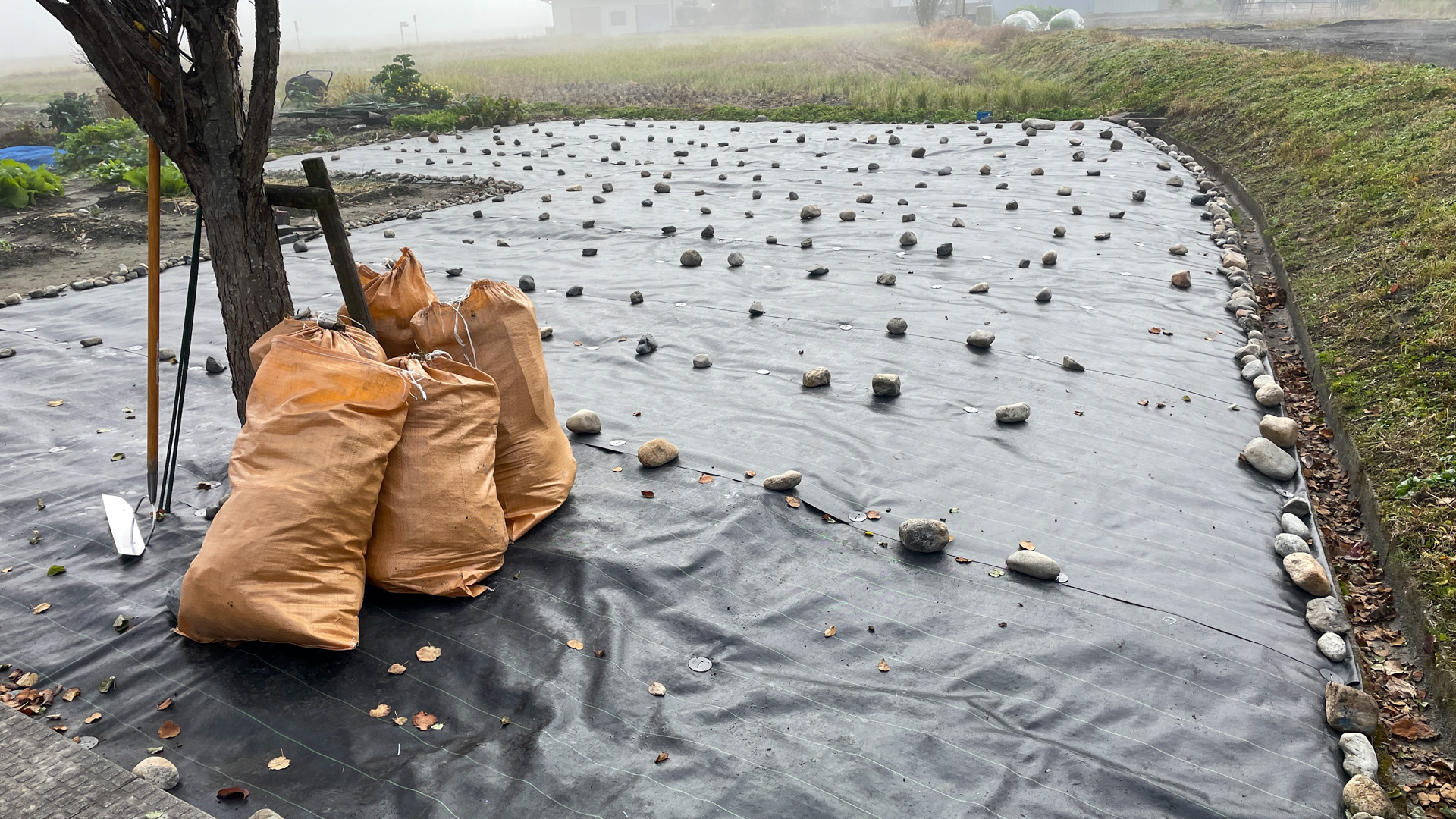 石を並べたほか、杭を1m間隔ほどに打ってシートを固定した。作業はこ1時間だったが、これまた、やれやれ。