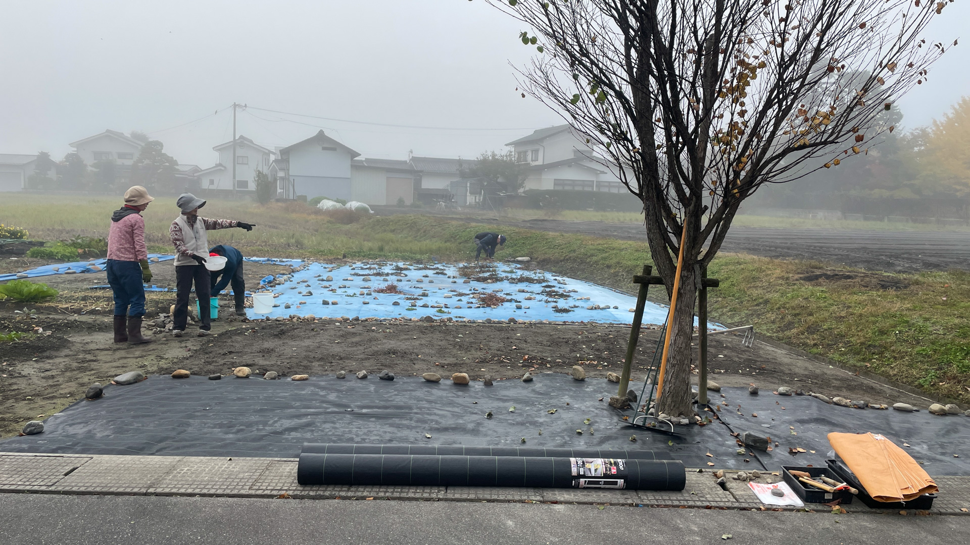 今までは空き地をブルーシートで覆っていたが、2年ほどでボロボロになって飛散してしまうため、本格的に防草シートを張ることにした。家庭菜園をしている人たちが本日、10人ほど集まり一斉作業をした。その結果、