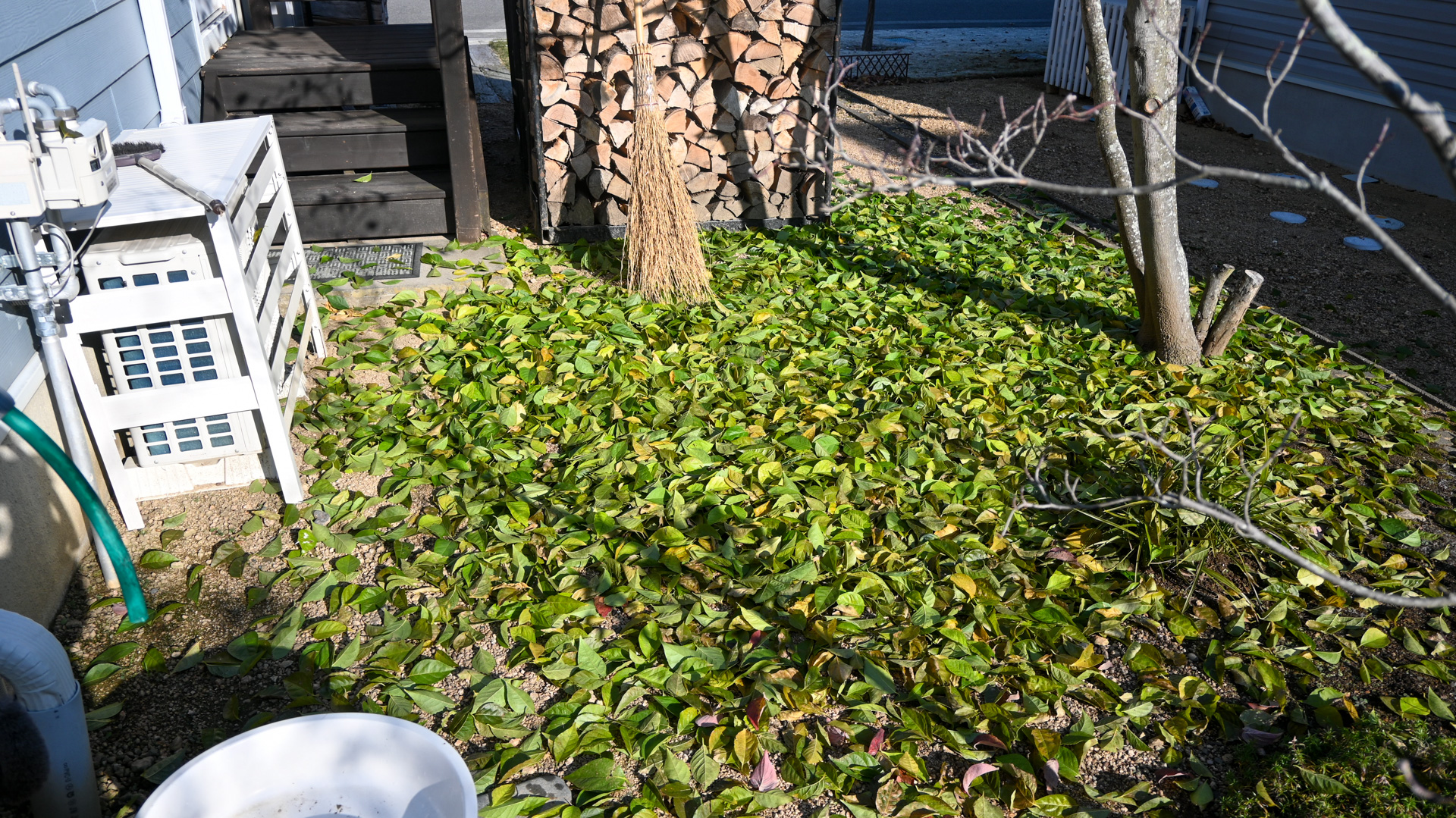 見事に落葉した。早朝の7時前、ゴミ出しに言った時はほとんど落葉していなかったのに数時間後はこの有り様に。一体どうなっているのだろう。今まででこんなに極端に一斉落葉したのは初めて。エゴノキは、と言えば
