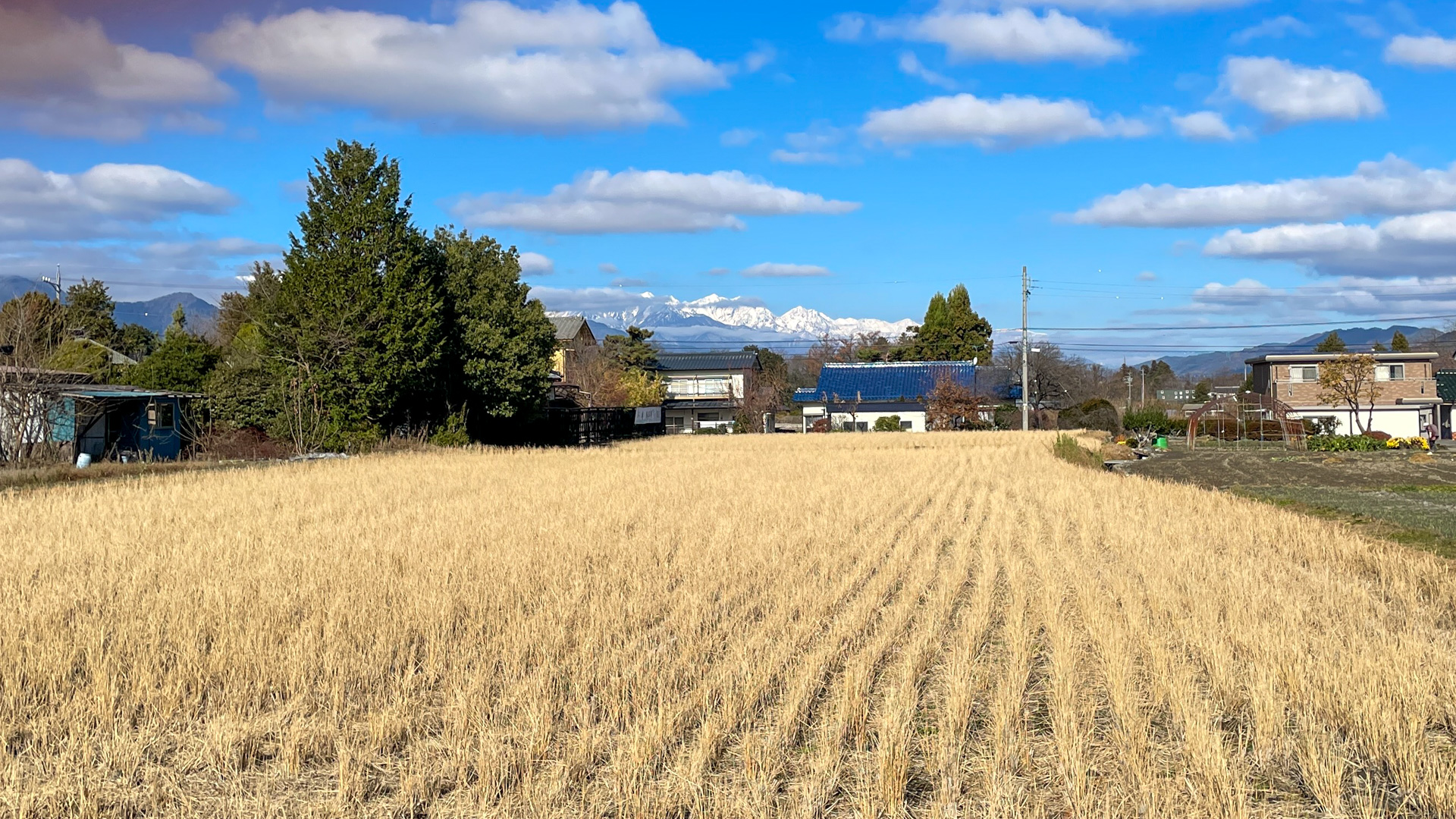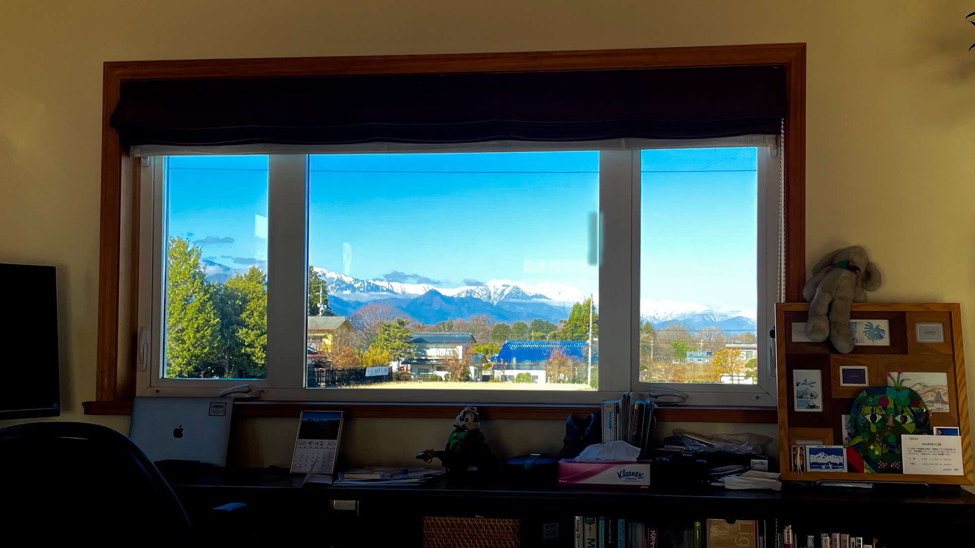 見えるは外の明るさの中の山風景。よく晴れた。ちょっと家を出て、家の前と言えば、