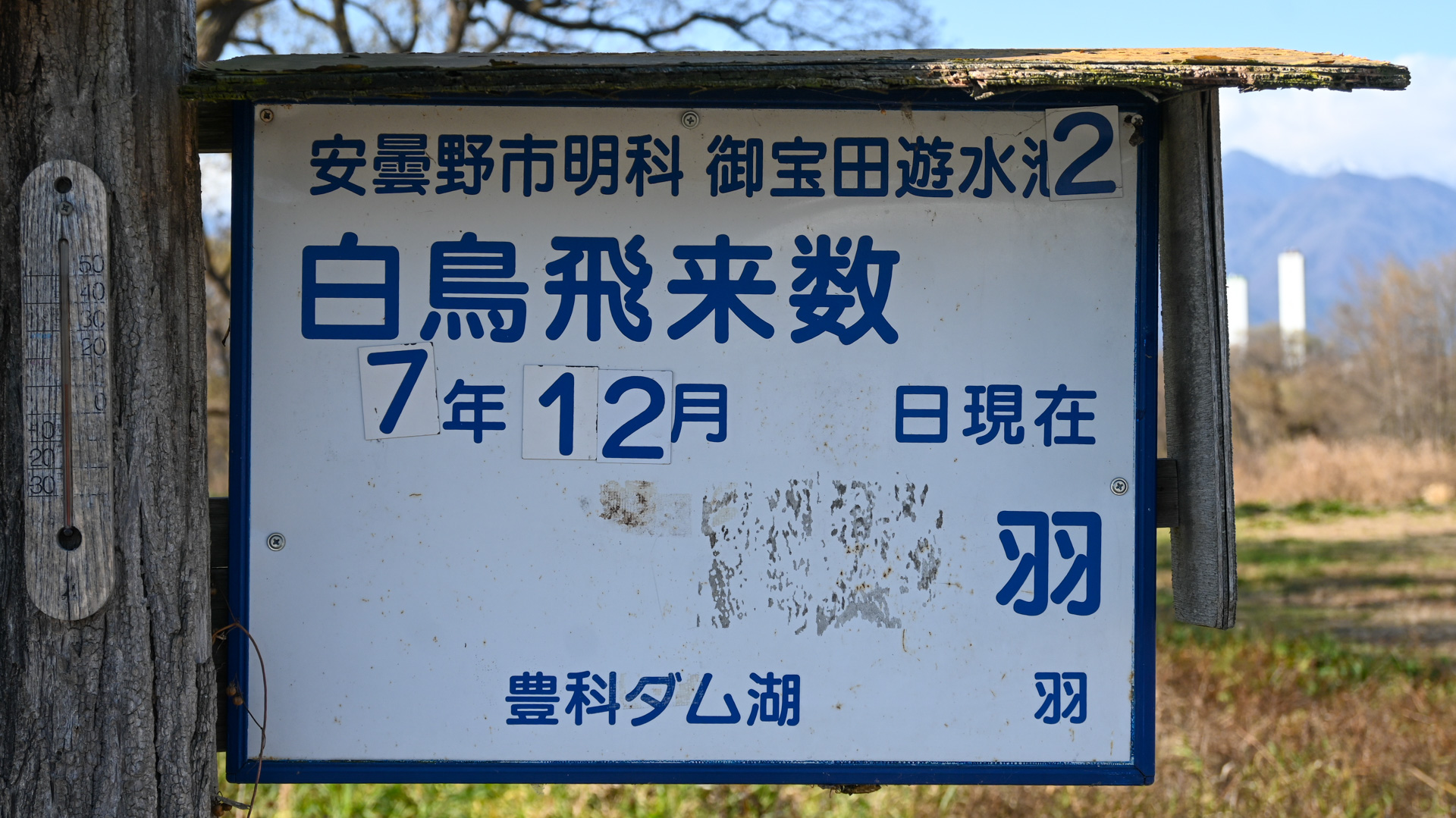 出かけた先は明科の遊水地。この時期はとっくにコハクチョウが飛来しているのに、いつもの看板には飛来数の記載がない。実際に池の脇に立つと、