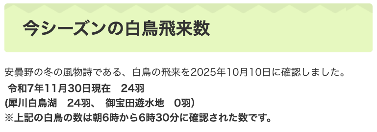 わずかに2羽のコハクチョウを発見。いつもなら数知れずいるはずなのに予想外だ。市の公式ホームページで調べてみると、