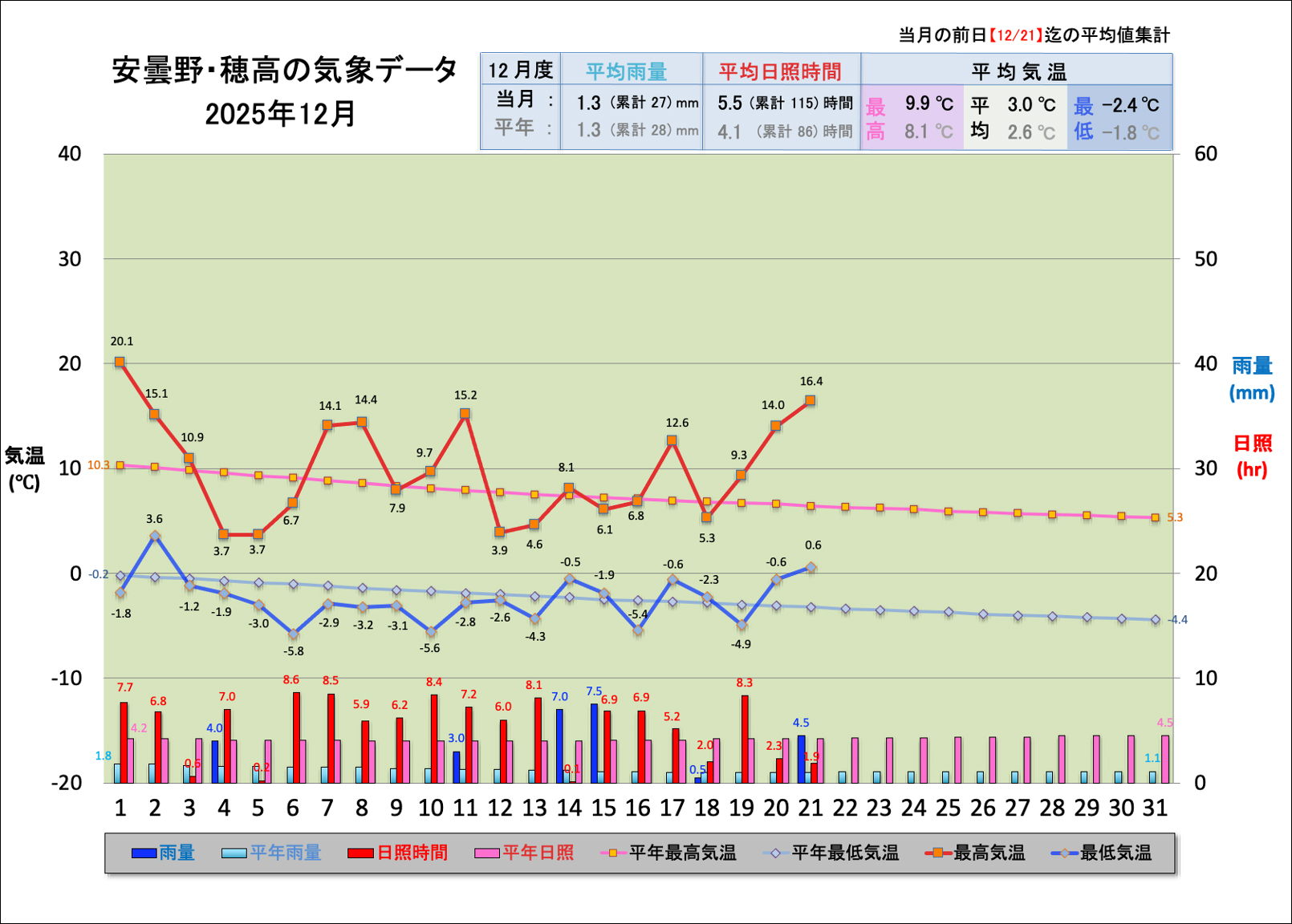 今日の安曇野・穂高の最低気温は1.7℃と平年よりもだいぶ高かった。でも最高気温は5.2℃と平年並みで日照時間が0とまるでなかった分、寒かった。気付けば今日は冬至。もう明日からは日が長くなるのだぁ〜、と想いもひとしお。ついでに穂高の今月の気象データを見ると、