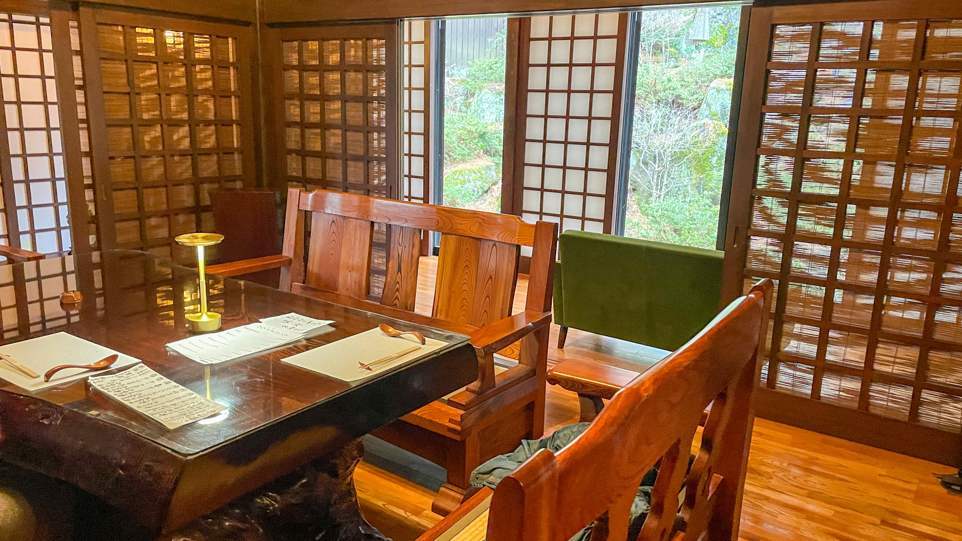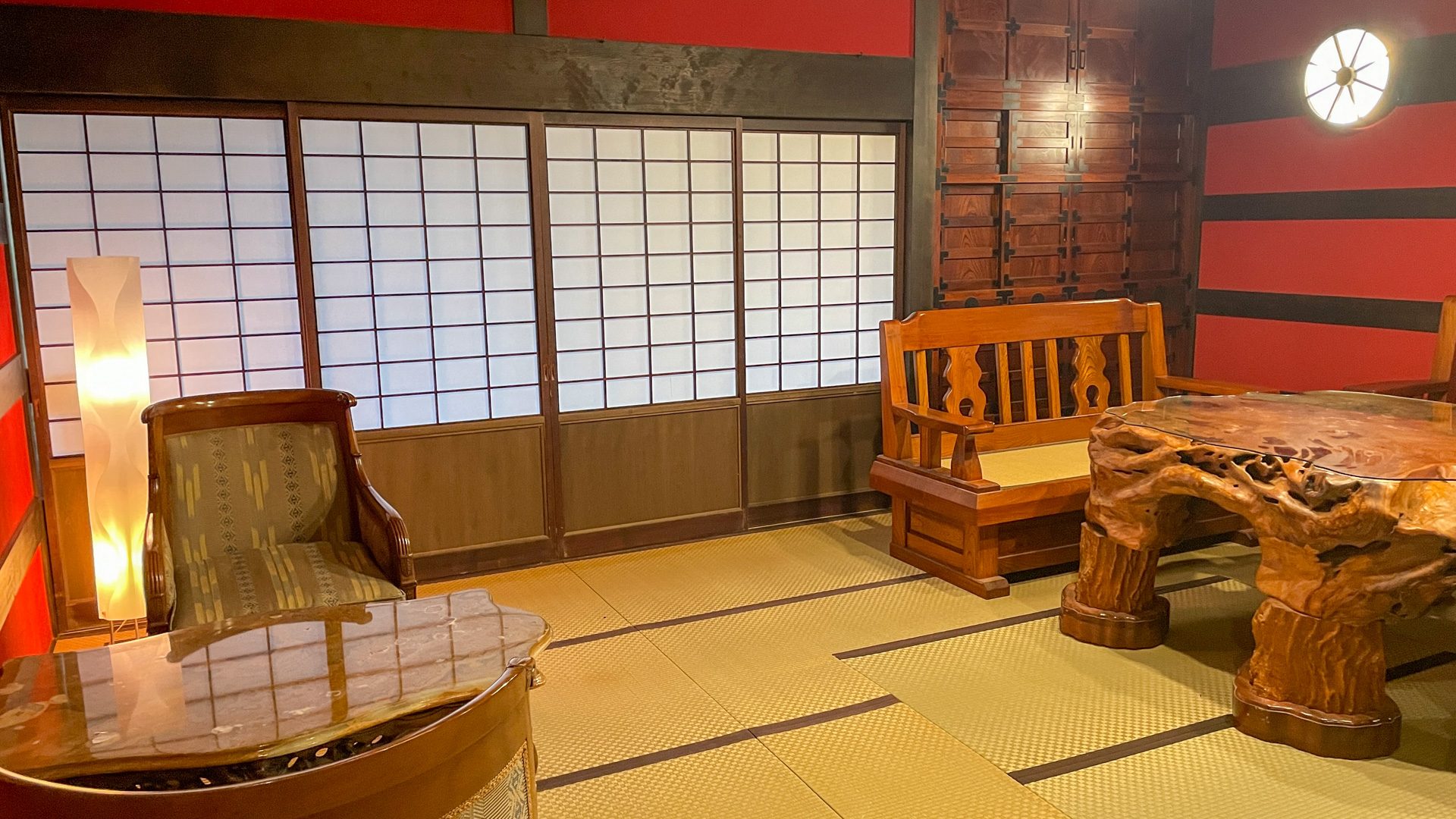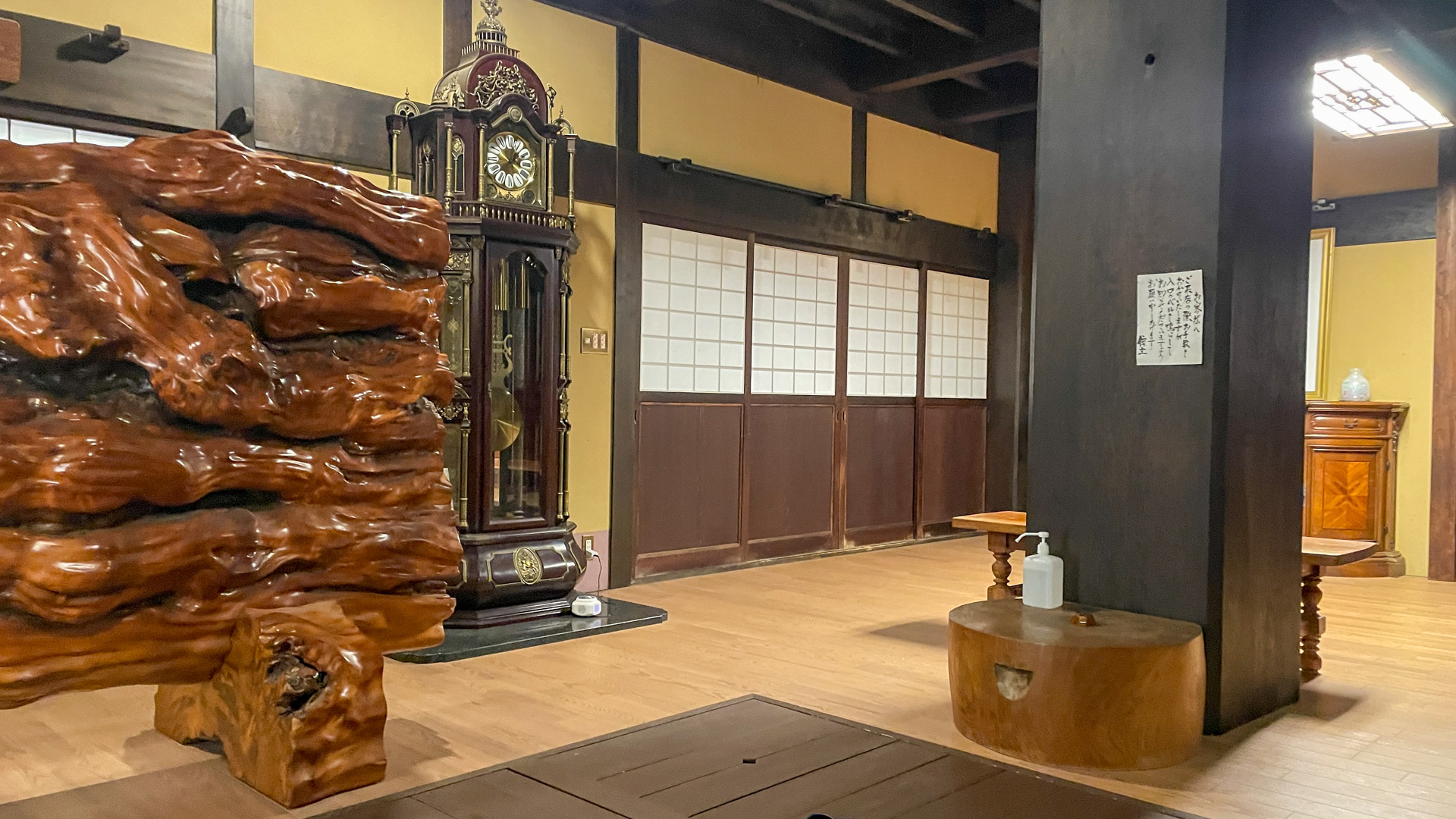 上がりかまちは室内なのに人の身長以上の大きな石がひかれていて、そこで靴を脱ぐと室内は昭和の雰囲気がただよう世界。待合場は、