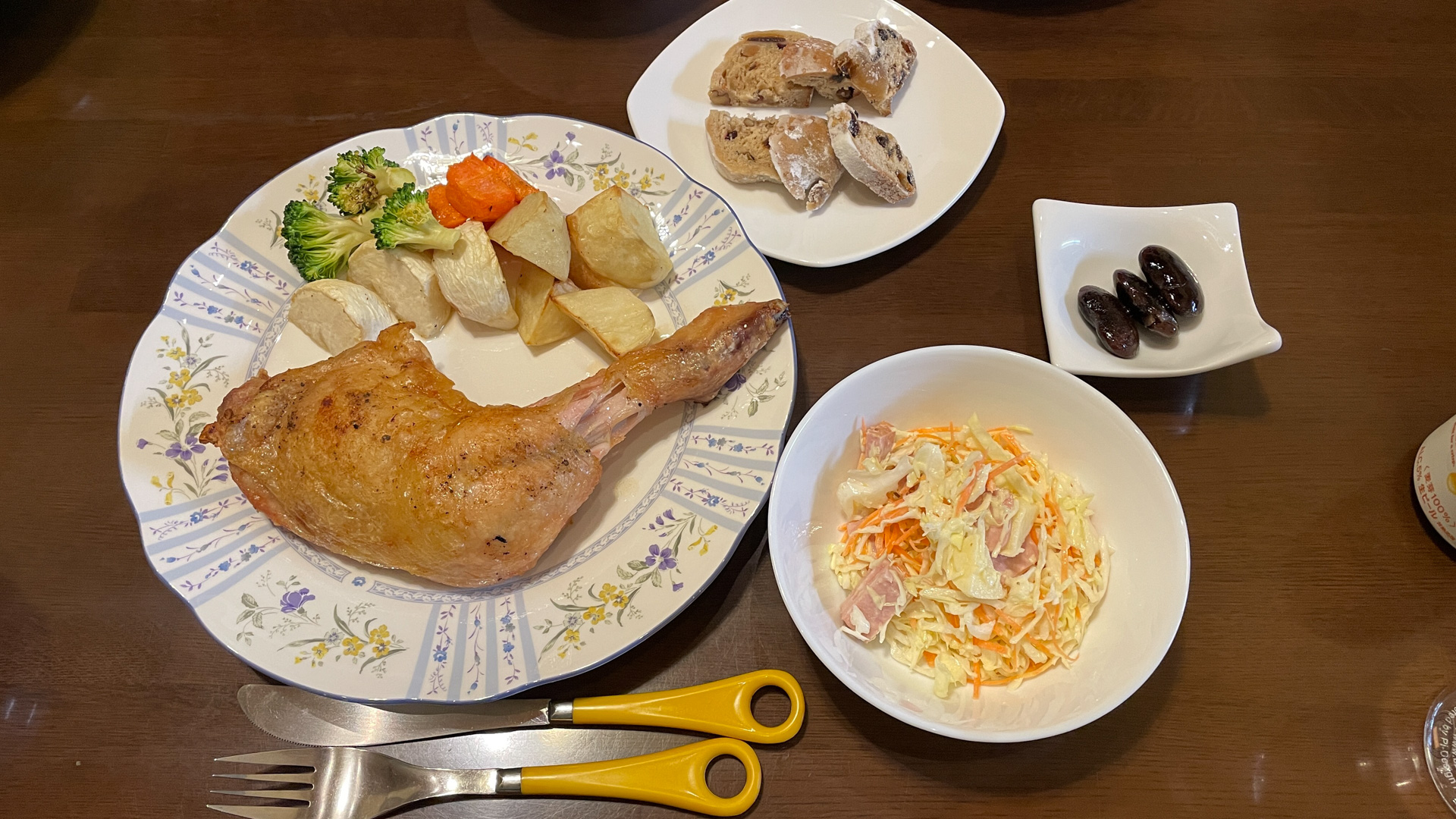 今日はうちのオバはんのクリスマス・バージョン、特別料理だ。骨付きチキンのオーブン焼きの右上はシュトーレン。これは手料理ではなく、購入品。何ともクリスマス気分が盛り上がった。鳥の骨付きと言えば、遠い昔に米国の兄弟会社の社員食堂で七面鳥のオーブン焼きが無料サービスされた、記憶が蘇った。確か12月にかけて半月ほど滞在した時で、11月のThanksGivingDayだったか、クリスマス休暇前のSpecial Dayだったかは覚えていない。美味しかっただけが、記憶の片隅にある。