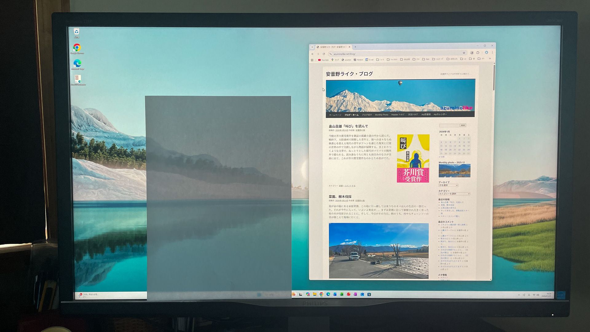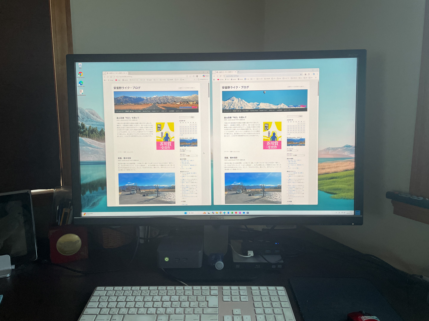 左がMicrosoft社のEdgeで、右がGoogle社のChrome。ディスプレーの左下にある小さな箱が今回、クリーンインストールしたミニPC。箱は小さいながら、画面は広大でブラウザなら2つ同時に余裕で見れる。32インチディスプレーにして良かったとつくづく思っている。この画面広さのイメージとして、