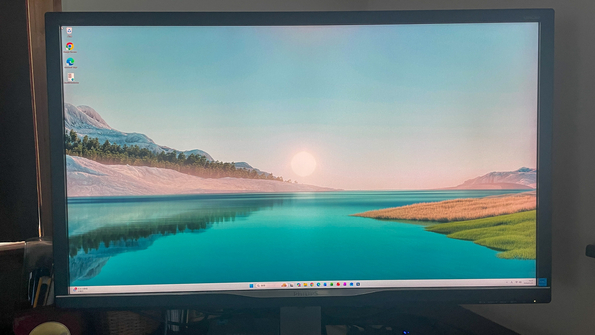 Win11の初期画面。ミニPCながら、画面解像度は4K。32インチのMac共用のディスプレーがMacと同じような高解像度画像が得られている。これで見るWebブラウザは、