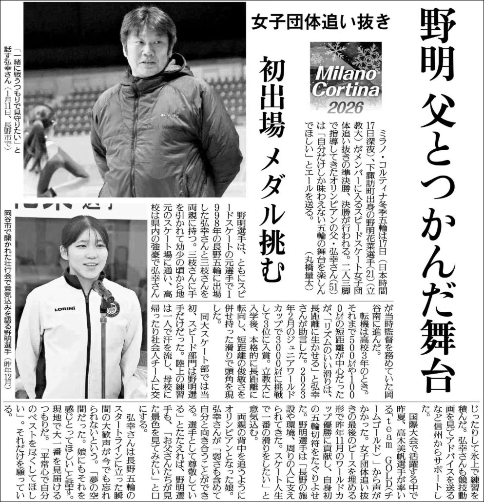 こんな記事があった。4人の選手の中から3人選んで滑る追い抜き競争で、最後のレースは上記の野明選手が走って銅メダルを獲得した。