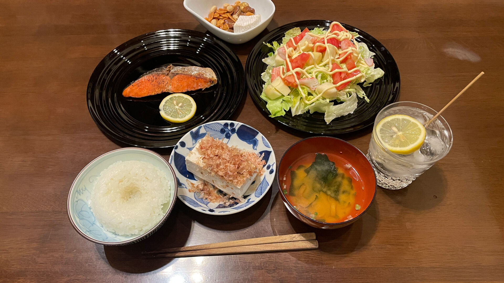 サラダに塩鮭、湯豆腐の簡単メニュー。本日から週末なので、ドライマティーニとおつまみの晩酌付き。これで、結構お腹にたまった。やれやれの3週間だった。