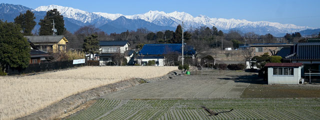 家の窓越しに捉えた白馬山系の遠景。この時期ならではの風景で、雪のない安曇野エリアと北信の雪山とのコンビネーション。晴天の陽射しに暖色系の春めいた装いが..。シャッターを切った時には気づかなかったが、写真最下部にはトンビが麦畑を低く滑空していた。