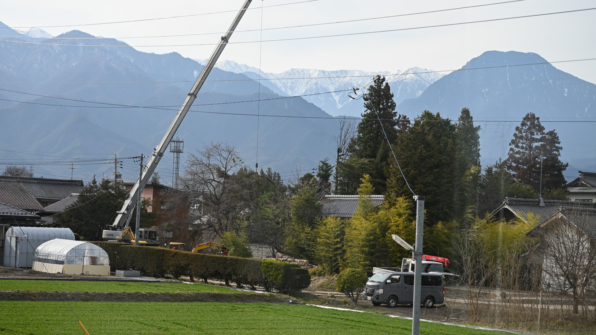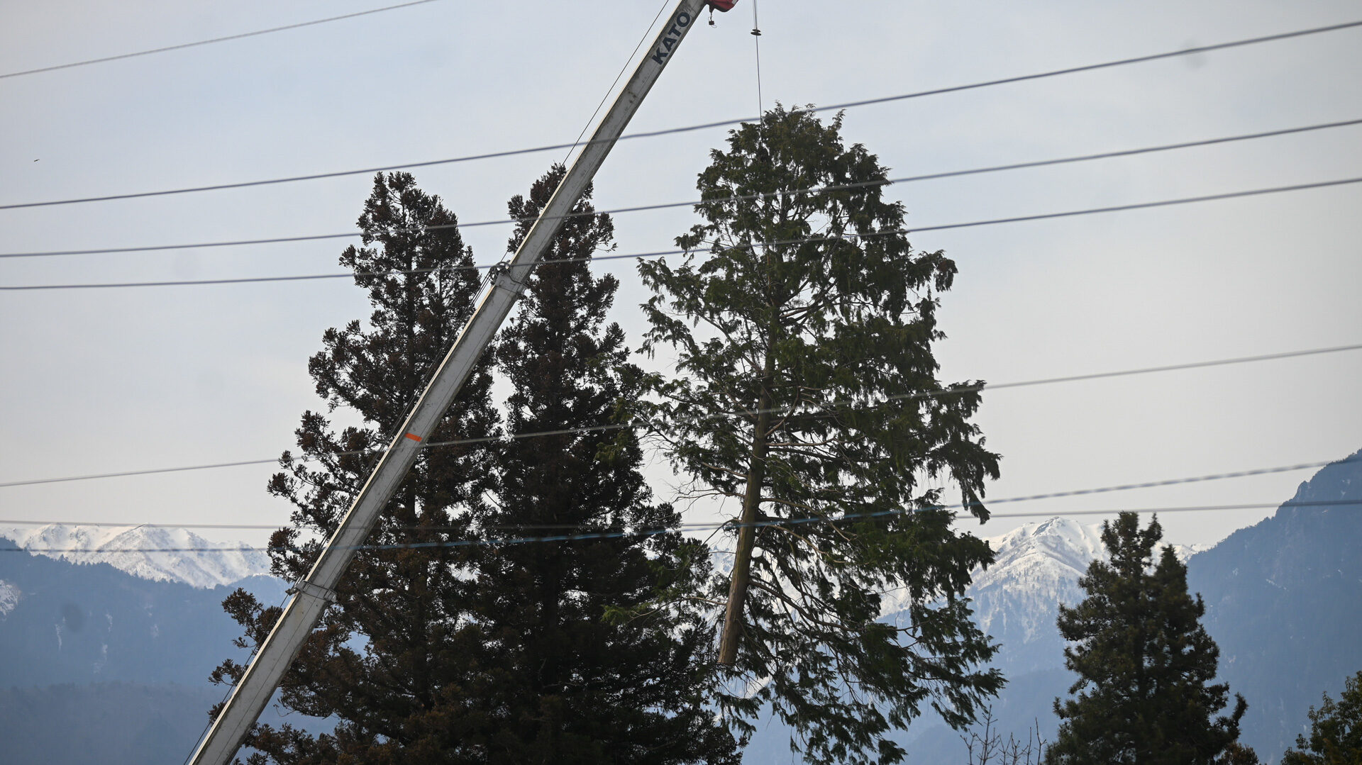 このように高木をクレーンで吊り上げて伐採するのを目の当たりにした。どうやって作業しているのだろうと、更にズームアップすると、