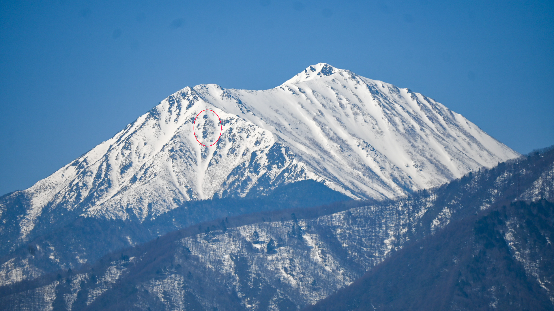 左の山の爺ヶ岳で数日前にはなかった雪形が見えてきた。更に拡大すると、