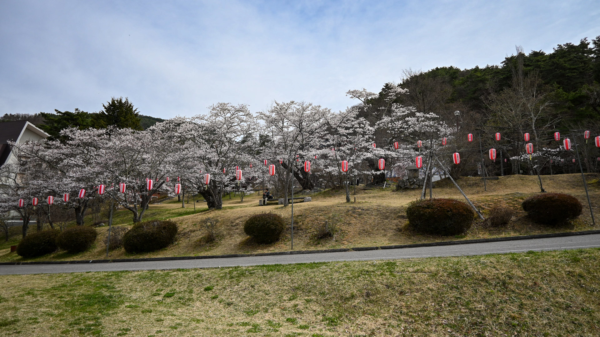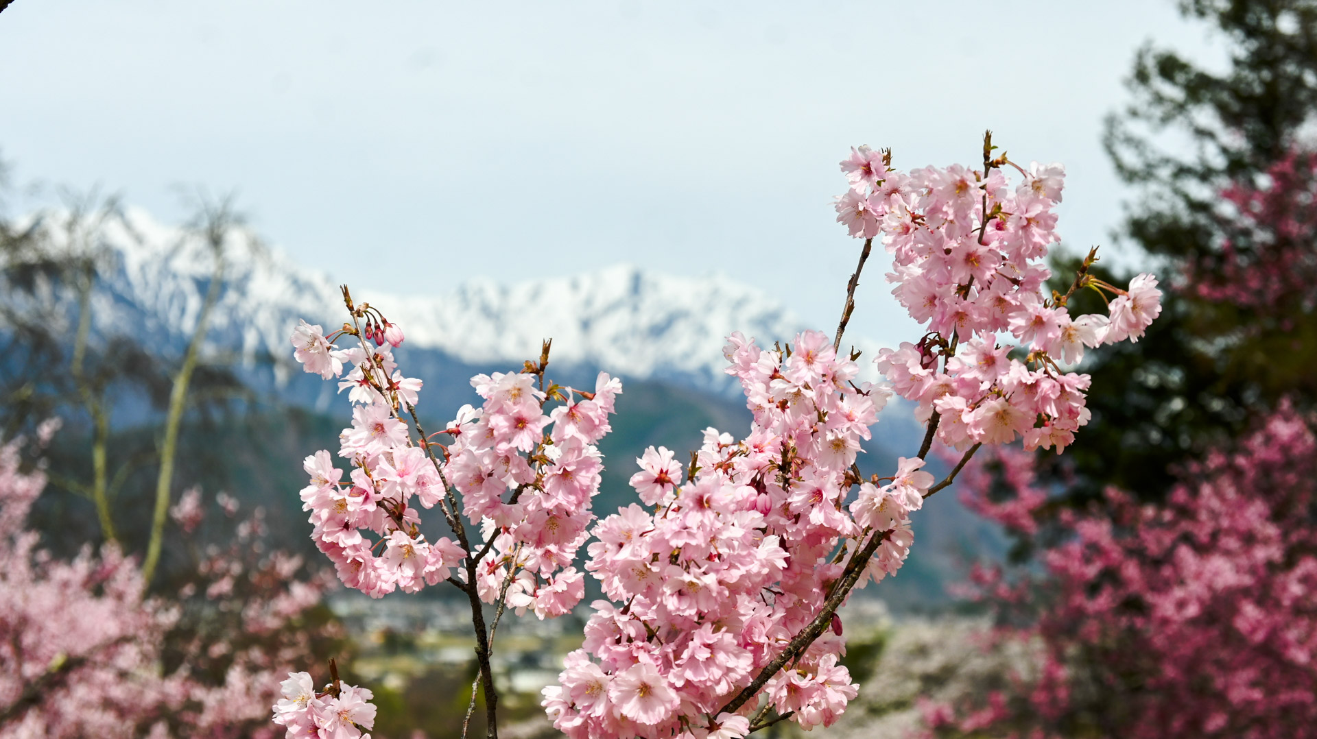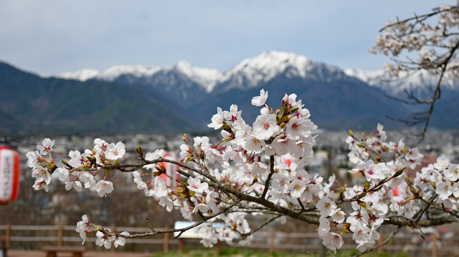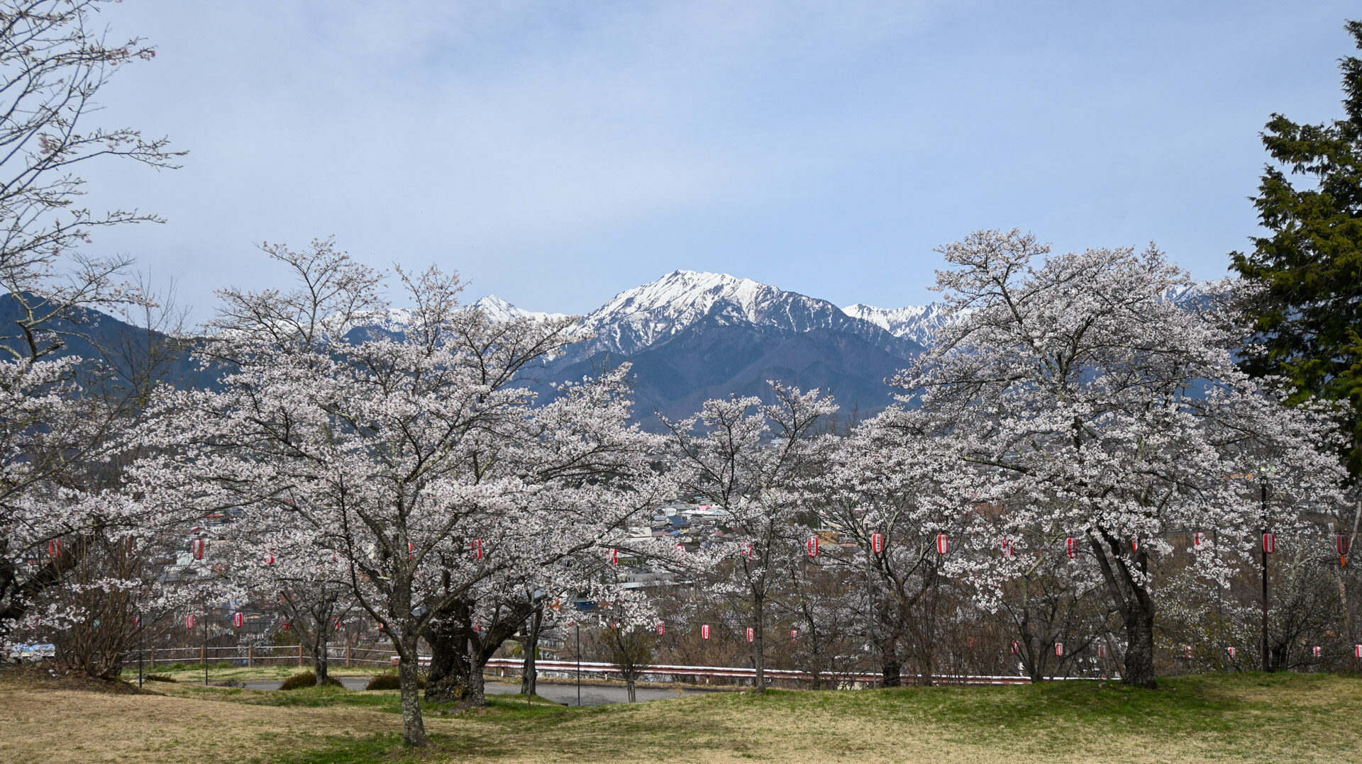 今日は晴れながら薄曇りで太陽光の光がイマイチか。桜はほぼ満開に近く見頃だ。ここの桜は大町市街地を一望にでき、背景の山岳風景が映える。