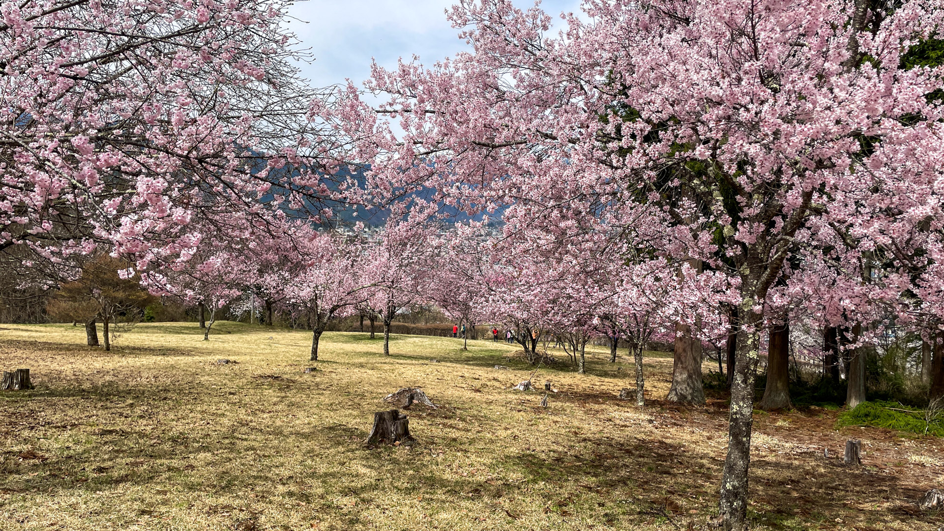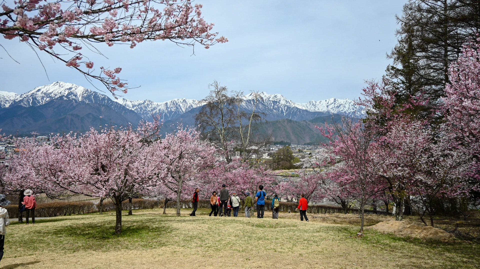 桜と白馬山系の山のコラボだ。ここは大山桜とコヒガン桜が多いのか、ピンクぽいのが特徴。近くを見回ると、