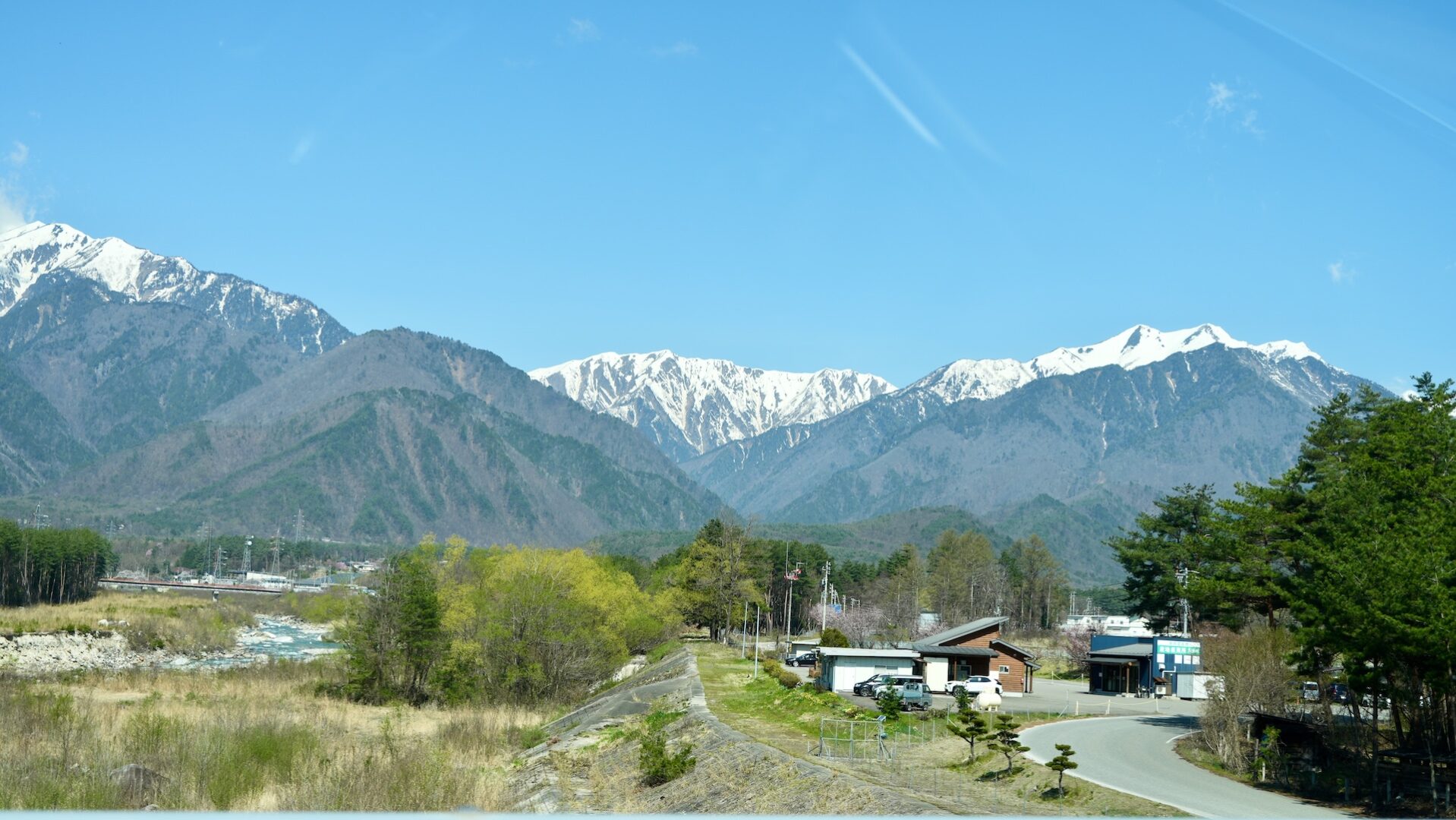 大町温泉郷近くの蓮華大橋、車上からのショット。今回のカメラ、オートフォーカスの俊敏さがいい。助手席で窓の横に流れる風景を確実に瞬時に捉える。そしてメカシャッターの音。普通のカメラは人造の電子シャッター音だけど、今回のカメラは正真正銘の機械式シャッターでいい音がする。周辺の桜状況を見ると、
