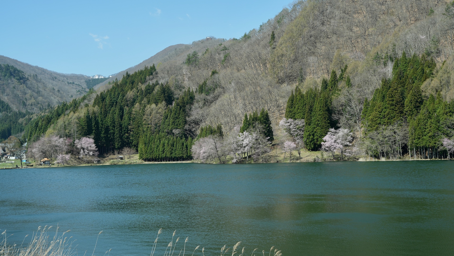 ここは中綱湖のオオヤマ桜。まだ咲き始めのようで、近場にアクセスするのは後日にした。そしてその奥の青木湖は、