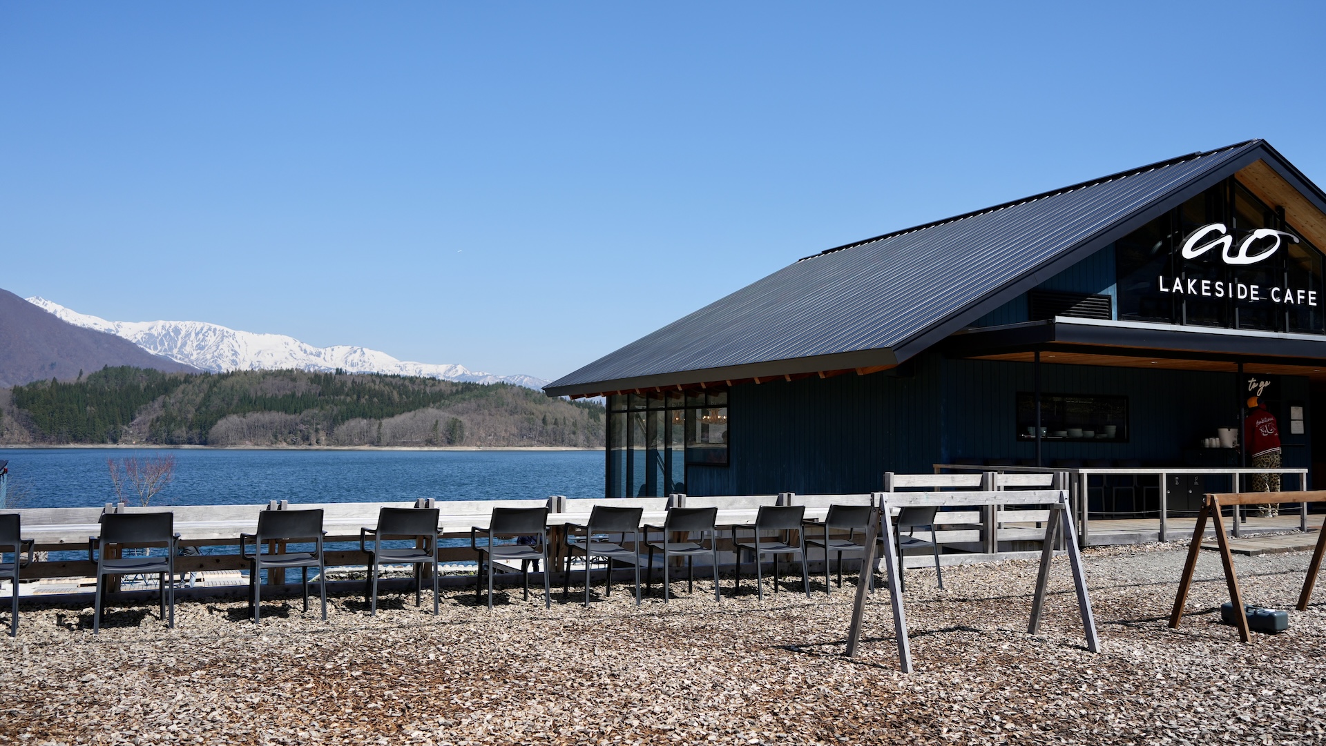 空と湖の青に挟まれた残雪の山がいい。青白青のサンドの隣には黒の建物がよくマッチしている。そして現地の白馬村・野平に入ると、
