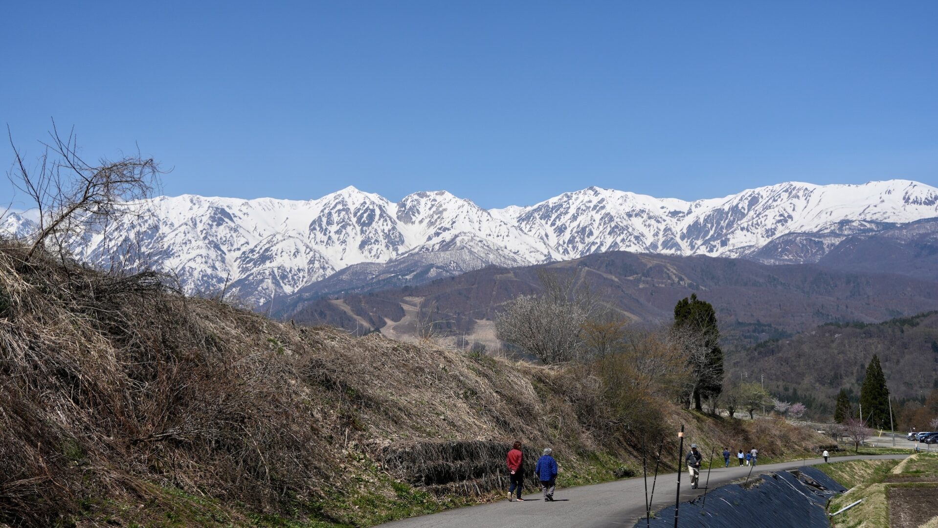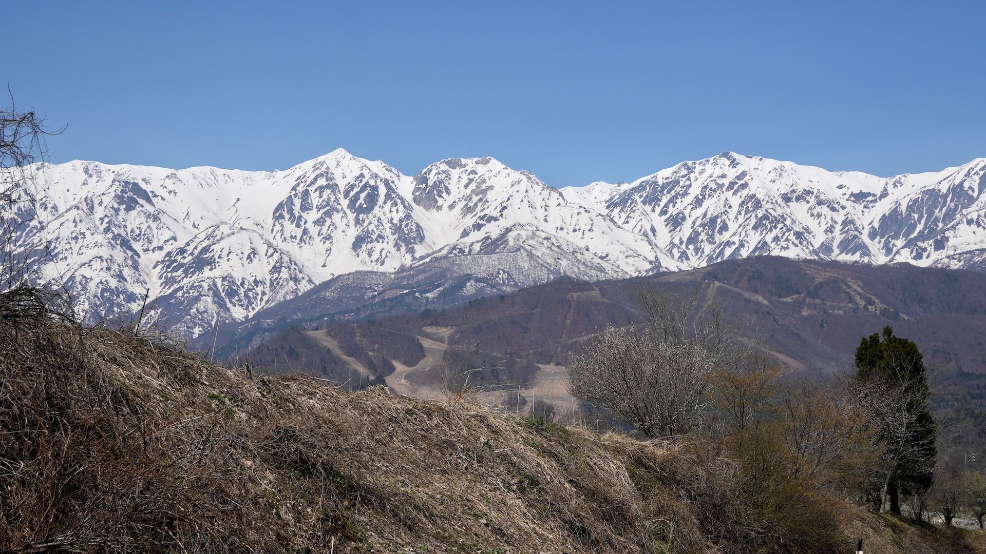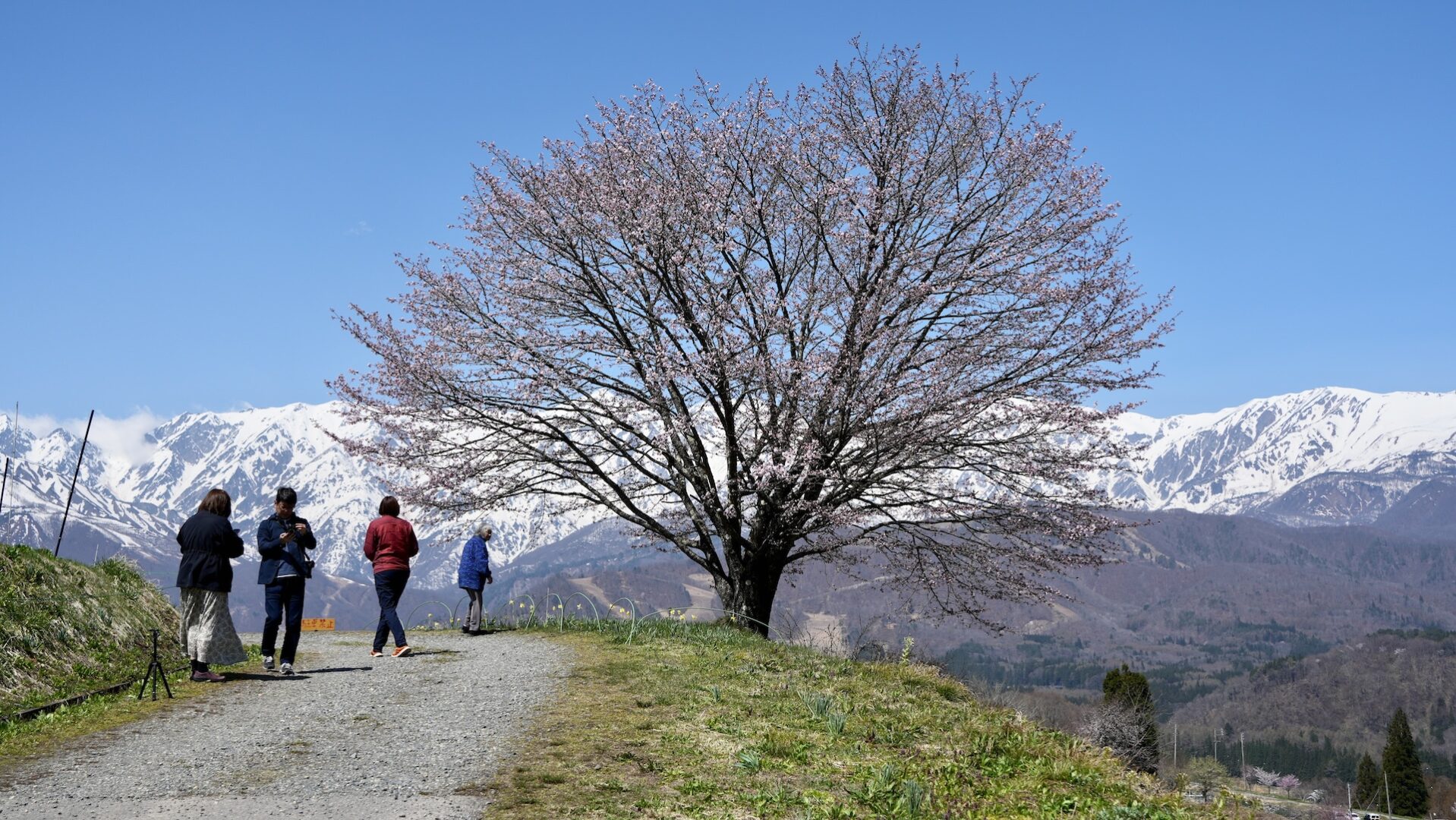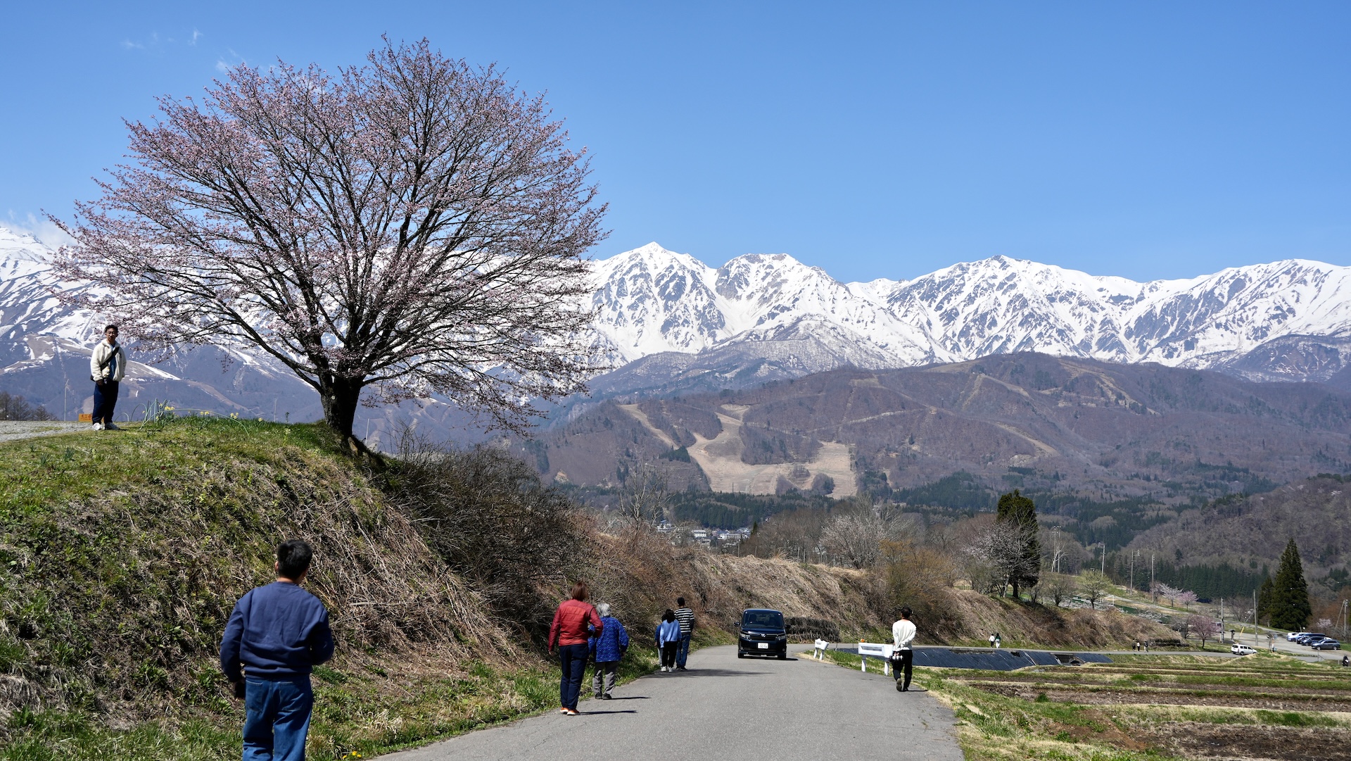 お目当ての一本桜はまだ咲き始めだった。ネット情報で今週末が見頃とのことで、天気の良い今日を狙ったのだけど残念。でも背景の白馬山系とのコンビよろしく、いい雰囲気だった。バックの山容、白馬三山を画角で比較すると、
